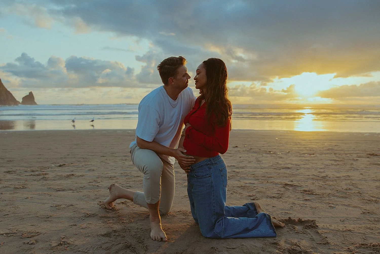 There’s something endlessly inspiring about photographing at Cannon Beach. The dramatic coastline, the shifting light, the way the water glazes the sand just enough to mirror the sky—it all adds up to a dreamlike setting. For this maternity session, the couple envisioned something creative yet timeless. They wanted portraits that felt artistic but still rooted in classic maternity style. With a sunset that delivered an absolute show and a peaceful evening by the sea, we got just that.